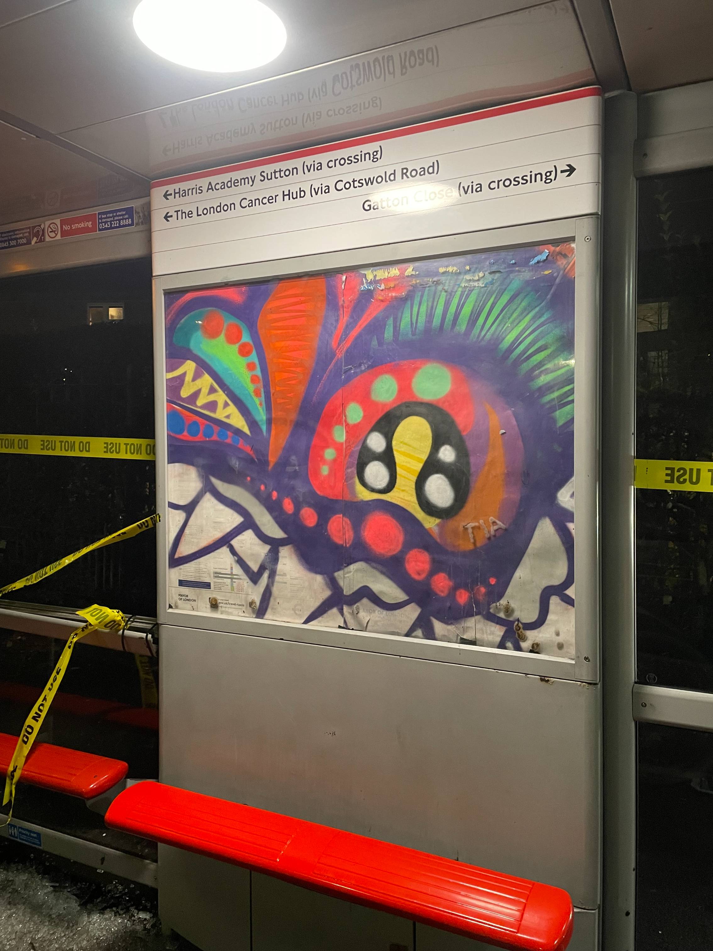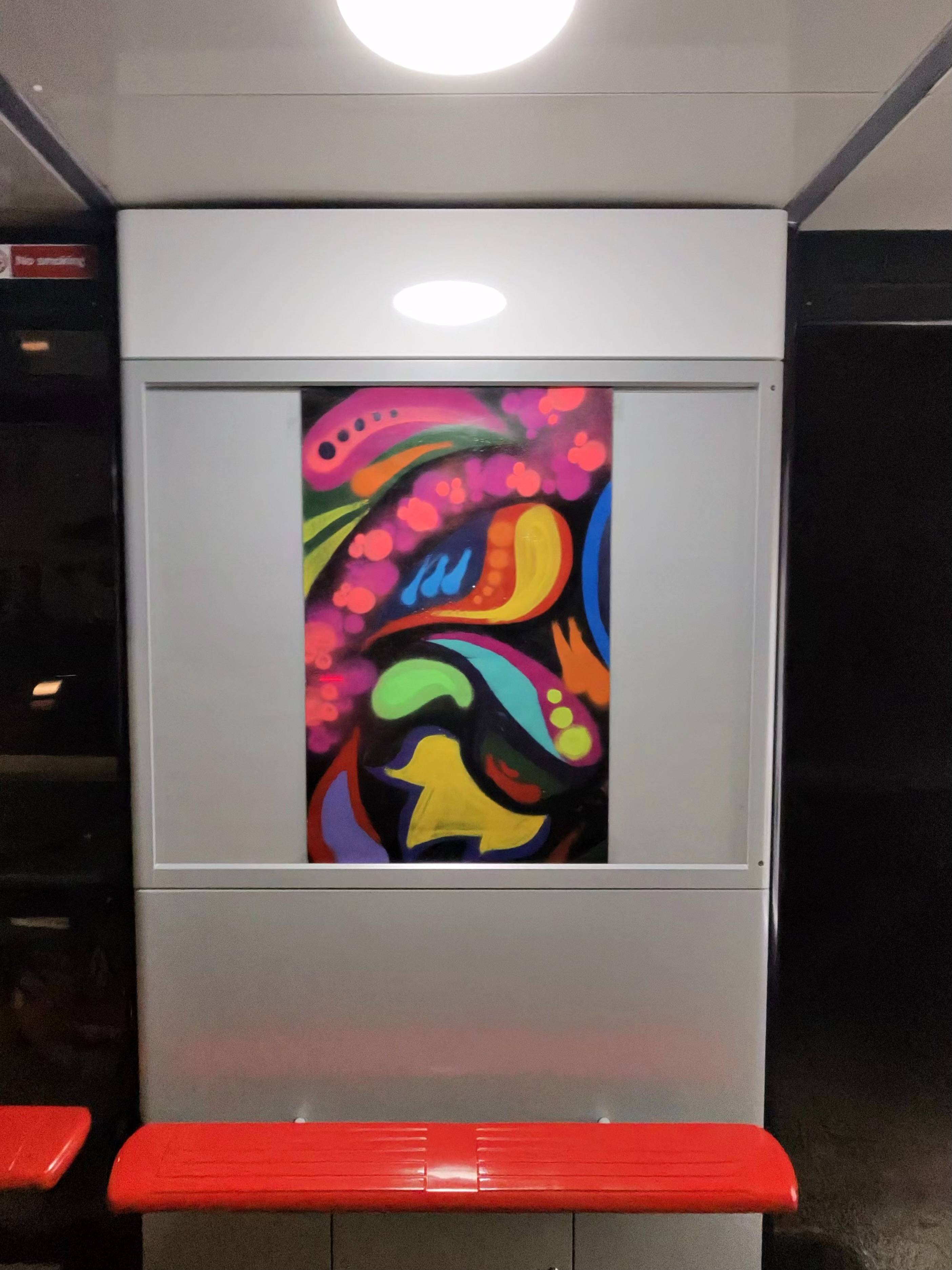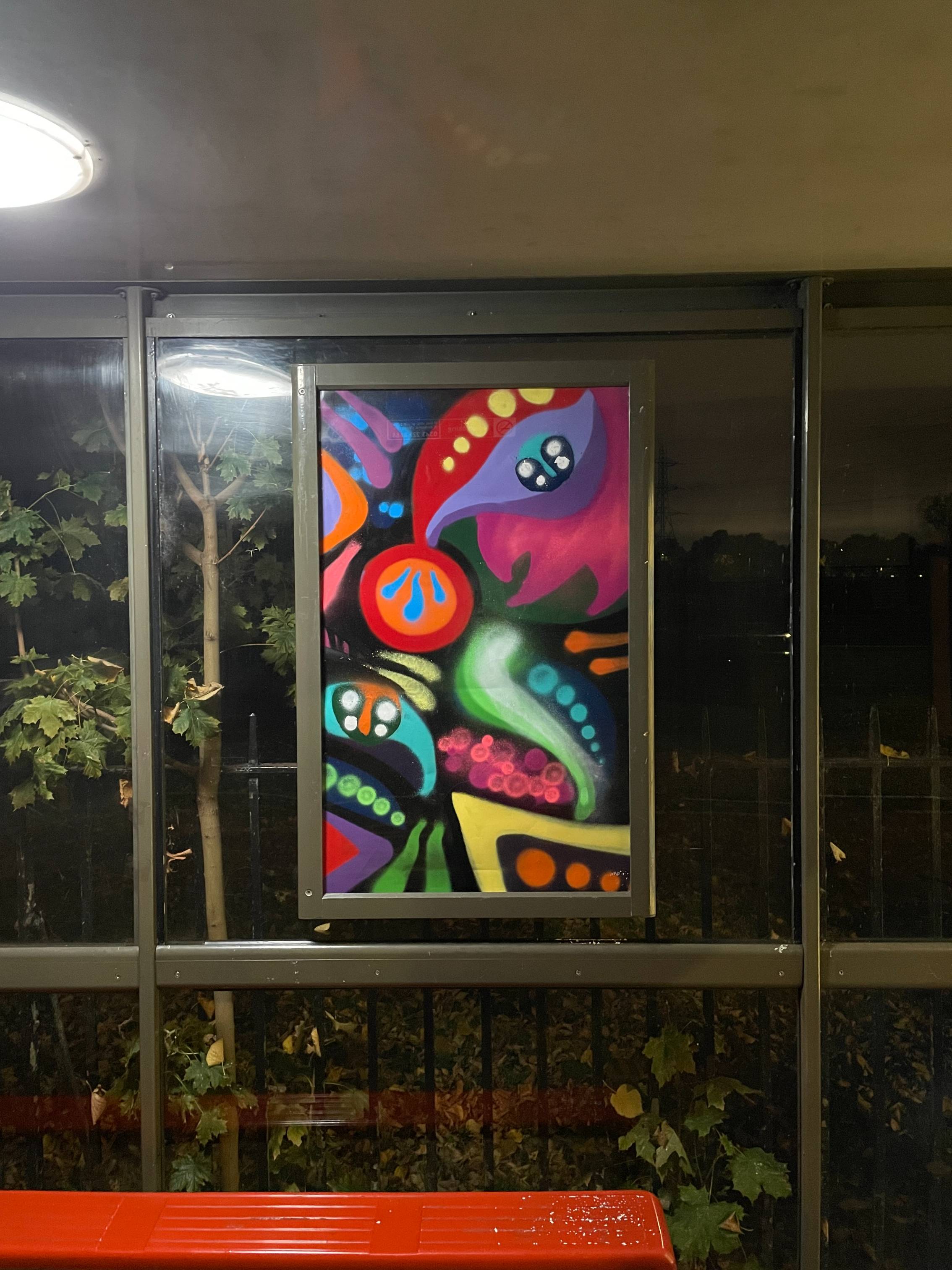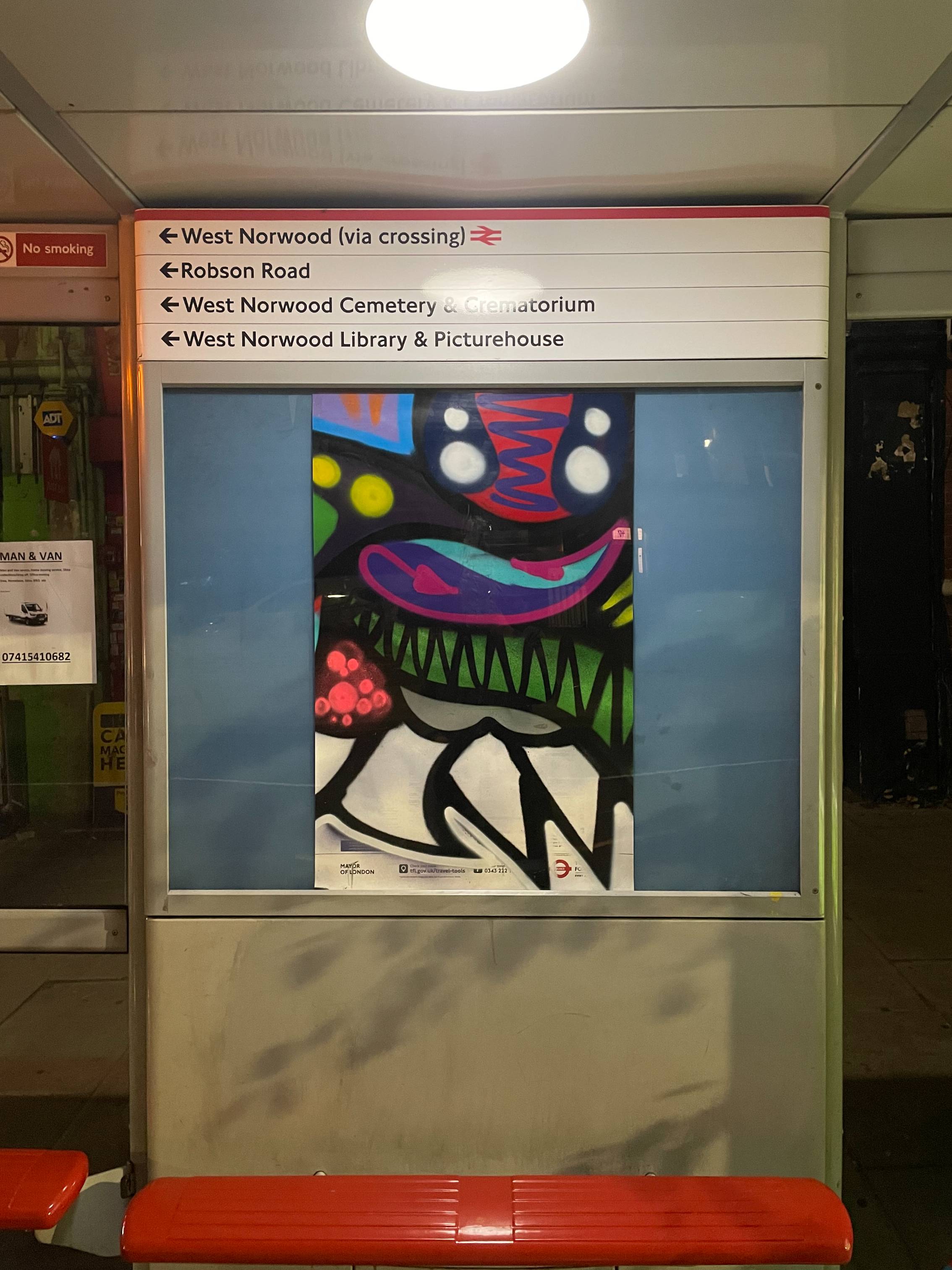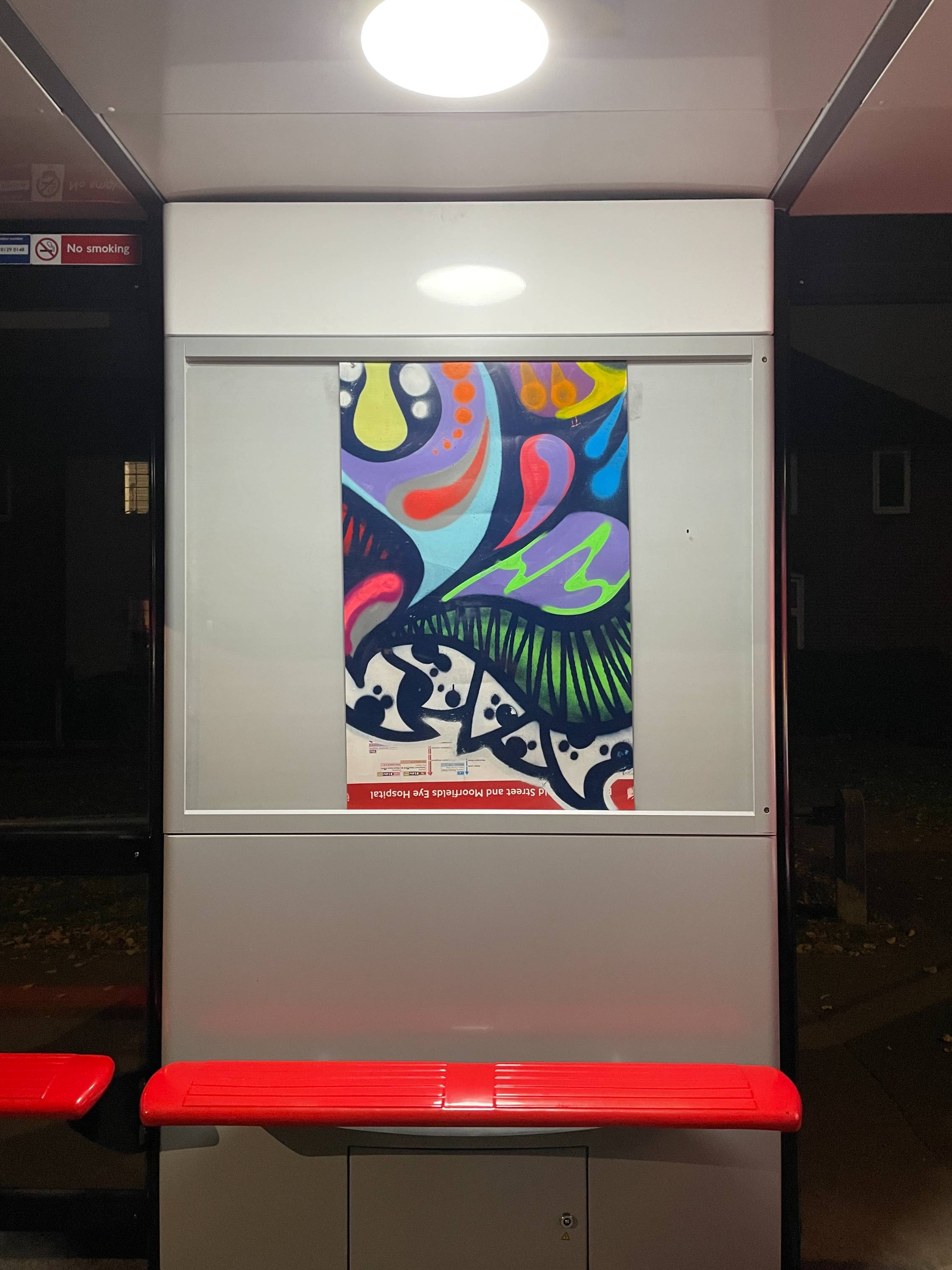 Krige commandeers public advertising spaces, transforming bus stop posters into guerrilla exhibitions. These interventions challenge who gets visibility in cities and bring art directly to the streets.
